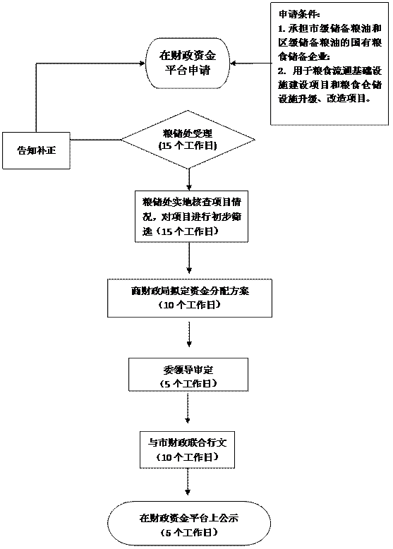 需提交的材料 | 1、粮食流通基础设施建设项目(复印件一式两份拟留件); 2、粮食仓储设施升级、改造项目(复印件一式两份拟留件)。 |
